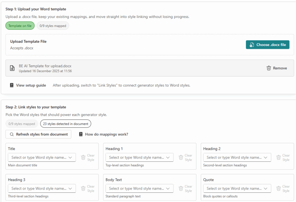 You can now easily apply your company’s branding to every document you generate. Upload your custom Word templates and map your preferred styles for a consistent, professional look. When you download documents, your organisation’s formatting is automatically applied, ensuring every file matches your brand guidelines. Choose how your content appears with the new style selector, and enjoy enhanced support for citations, custom filenames, and improved formatting for tables, lists, and structured content.